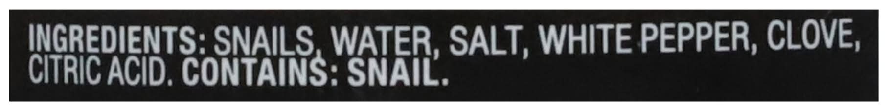Ingredients: Water, Salt, White Pepper, Clove, Citric Acid Contains: Molluscan Shellfish, Snails (Escargot)
