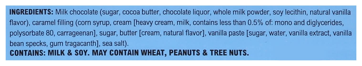 Ingredients: Milk Chocolate (Sugar, Cocoa Butter, Chocolate Liquor, Whole Milk Powder, Soy Lecithin, Natural Vanilla Flavor), Caramel Filling (Corn Syrup, Cream [Heavy Cream, Milk, Contains Less than 0.5% of: Mono and Diglycerides, Polysorbate 80, Carrageenan], Sugar, Butter [Cream, Natural Flavor], Vanilla Paste [Sugar, Water, Vanilla Extract, Vanilla Bean Specks, Gum Tragacanth], Sea Salt) Contains: Milk, Soybeans, Corn, Wheat, Peanuts, Tree Nuts