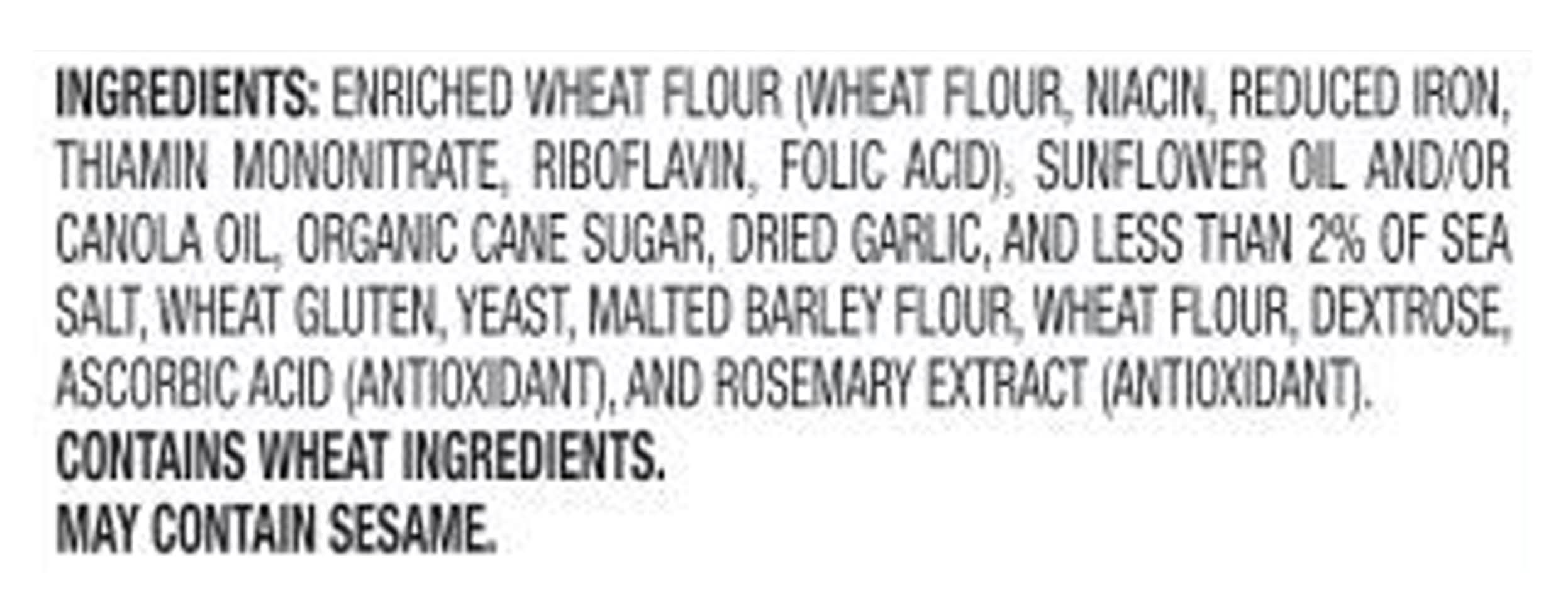 Ingredients: Enriched Wheat Flour (Wheat Flour, Niacin, Reduced Iron, Thiamin Mononitrate, Riboflavin, Folic Acid), Sunflower Oil and/or Canola Oil, Organic Cane Sugar, Dried Garlic, and Less than 2% of Sea Salt, Wheat Gluten, Yeast, Malted Barley Flour, Wheat Flour, Dextrose, Ascorbic Acid (Antioxidant), and Rosemary Extract (Antioxidant) Contains: wheat, gluten, Barley, Sesame