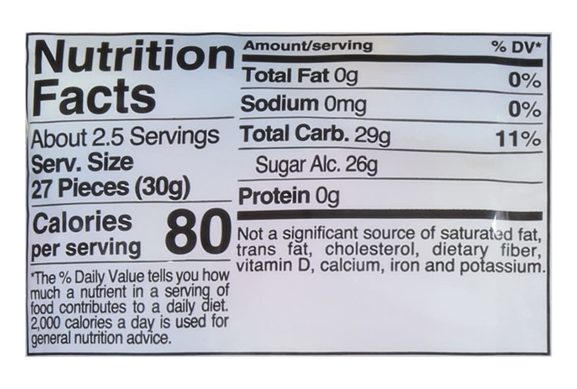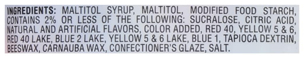 Ingredients: Maltitol Syrup, Maltitol, Modified Food Starch, Contains 2% or Less of the Following: Sucralose, Citric Acid, Natural and Artificial Flavors, Color Added, Red 40, Yellow 5 & 6, Red 40 Lake, Blue 2 Lake, Yellow 5 & 6 Lake, Blue 1, Tapioca Dextrin, Beeswax, Carnauba Wax, Confectioner’s Glaze, Salt Contains: 'Gluten Free From', 'Peanuts Free From'