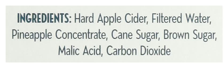 Ingredients: Hard Apple Cider, Filtered Water, Pineapple Concentrate, Cane Sugar, Brown Sugar, Malic Acid, Carbon Dioxide