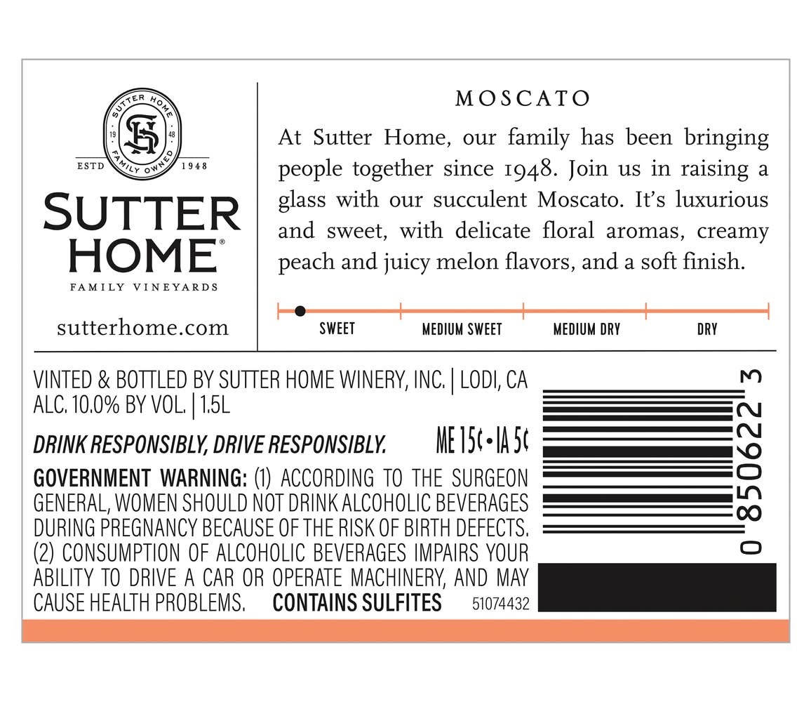 Sutter Home Moscato Wine is a sweet, creamy, luxurious wine. Delicate aromas of white peaches and exotic lychee on the nose lead to creamy peach and juicy melon flavors with hints of caramel on the palate. Refreshing acidity and a vivid, crisp finish balance the luxuriously sweet flavors. Sutter Home Wine has been awarded Reserve Class Champion, Double Gold - 2019 Houston Livestock & Rodeo and Best of Class - 2019 San Francisco International and 90 points - Gold from 2020 San Diego International. As you gather around the table this holiday season, enjoy Sutter Home wine in your favorite wine glasses with mashed potatoes, chicken, turkey, stuffing and all the pumpkin & apple pies. Or get cozy around the fireplace and warm up while enjoying a glass of wine. Sutter Home wines is the perfect holiday gift. Whether you gift wine as a stocking stuffer, to your neighbor across the street, or serve at your own holiday table. Sutter Home wines are a great addition to holiday wine gift sets! Sutter Home, family owned since 1948, is the brand generations of wine lovers trust to deliver consistent, award-winning quality and value for every wine occasion. Alcohol by volume: 10%