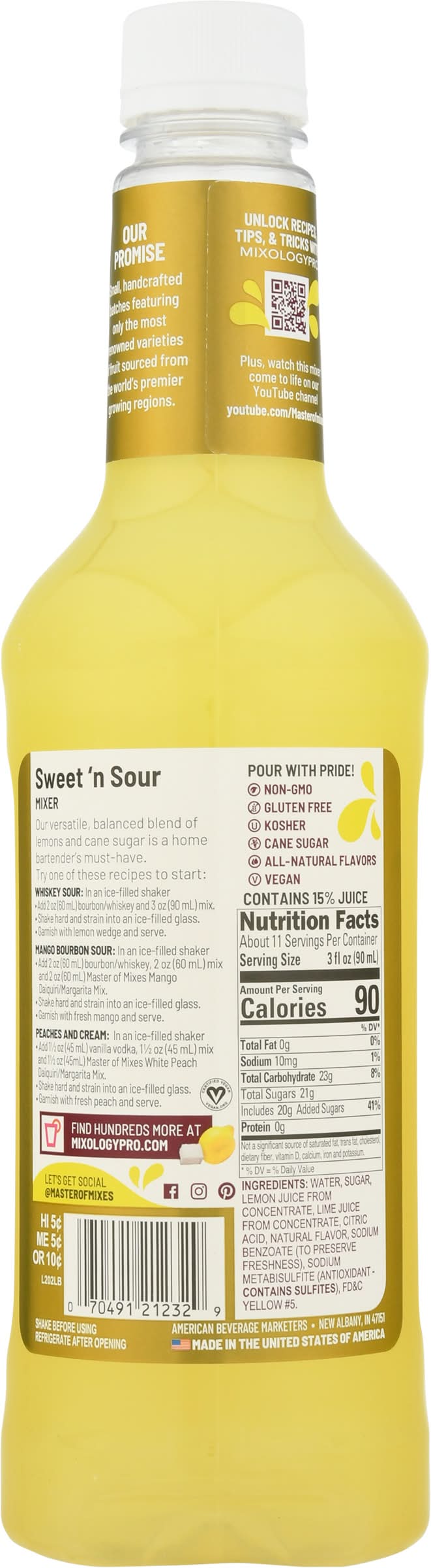 Directions: shake before using. refrigerate after opening. whiskey sour: in an ice-filled shaker. add 2 oz (60 ml) bourbon/whiskey and 3 oz (90 ml) mix. shake hard and strain into an ice-filled glass. garnish with lemon wedge and serve. peaches and cream: in an ice-filled shaker. add 1-1/2 oz (45 ml) vanilla vodka, 1-1/2 oz (45 ml) mix and 1-1/2 oz (45 ml) master of mixes white peach daiquiri/margarita mix. shake hard and strain into an ice-filled glass. garnish with fresh peach and serve. mango bourbon sour: in an ice-filled shaker. add 2 oz (60 ml) bourbon/whiskey, 2 oz (60 ml) mix and 2 oz (60 ml) master of mixes mango daiquiri/margarita mix. shake hard and strain into an ice-filled glass. garnish with fresh mango and serve.