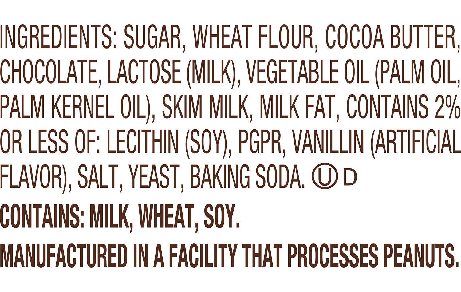 Ingredients: SUGAR, WHEAT FLOUR, COCOA BUTTER, CHOCOLATE, VEGETABLE OIL [PALM OIL; PALM KERNEL OIL], LACTOSE (MILK), SKIM MILK, MILK FAT, CONTAINS 2% OR LESS OF: LECITHIN (SOY), PGPR, VANILLIN, ARTIFICIAL FLAVOR, SALT, YEAST, BAKING SODA Contains: Contains: Wheat|Soy|Milk