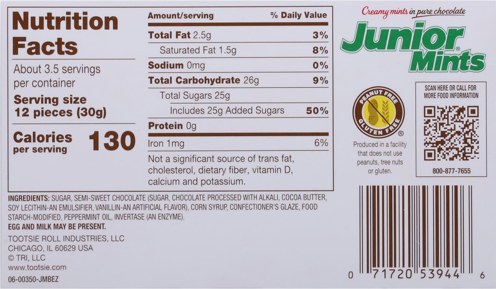 Creamy mints in pure chocolate. Peanut free. Gluten free. Produced in a facility that does not use peanuts, tree nuts, or gluten. Min. 35 pieces. Product sold by weight not volume. Contents tend to settle after packaging. Tootsie Roll Industries, LLC, Chicago, IL, 60629