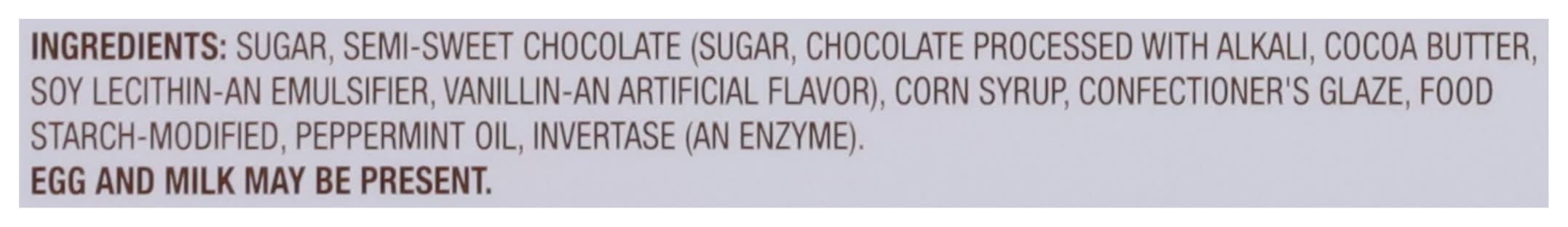 Ingredients: Sugar, Semi-Sweet Chocolate (Sugar, Chocolate Processed with Alkali, Cocoa Butter, Soy Lecithin-an Emulsifier, Vanillin-an Artificial Flavor), Corn Syrup, Confectioner's Glaze, Food Starch-Modified, Peppermint Oil, Invertase (an Enzyme) Contains: Soybeans, Eggs, Milk