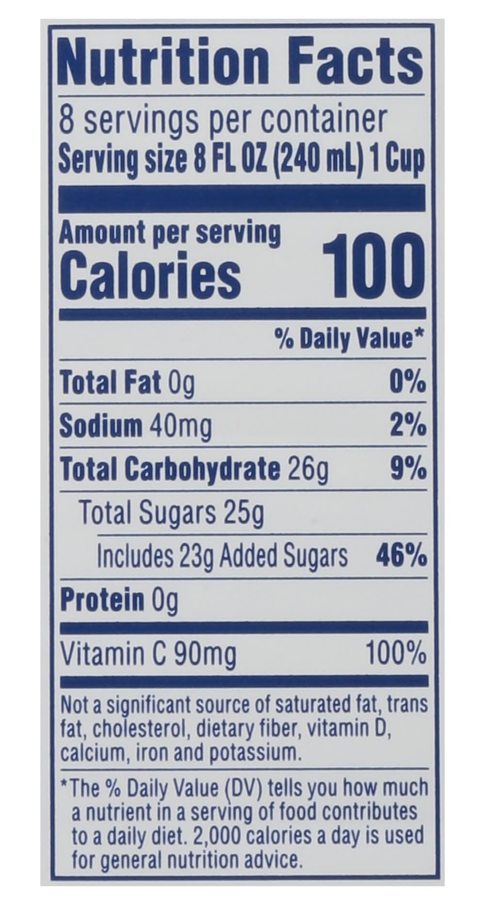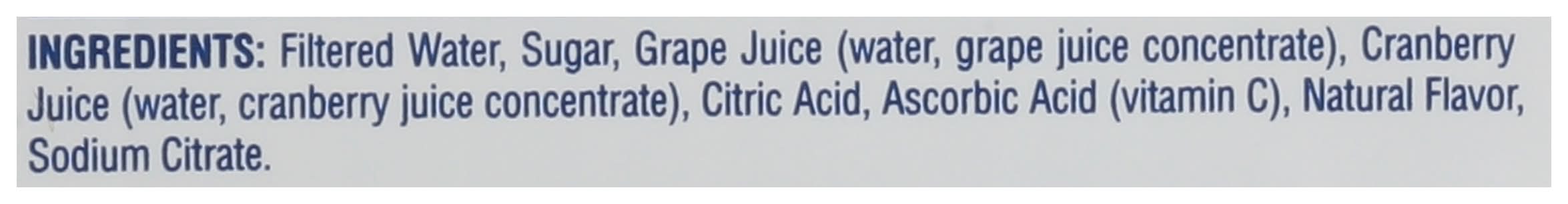 Ingredients: Filtered Water, Sugar, White Grape Juice (water, white grape juice concentrate), Cranberry Juice (water, cranberry juice concentrate), Citric Acid, Ascorbic Acid (vitamin C), Natural Flavor, Sodium Citrate.