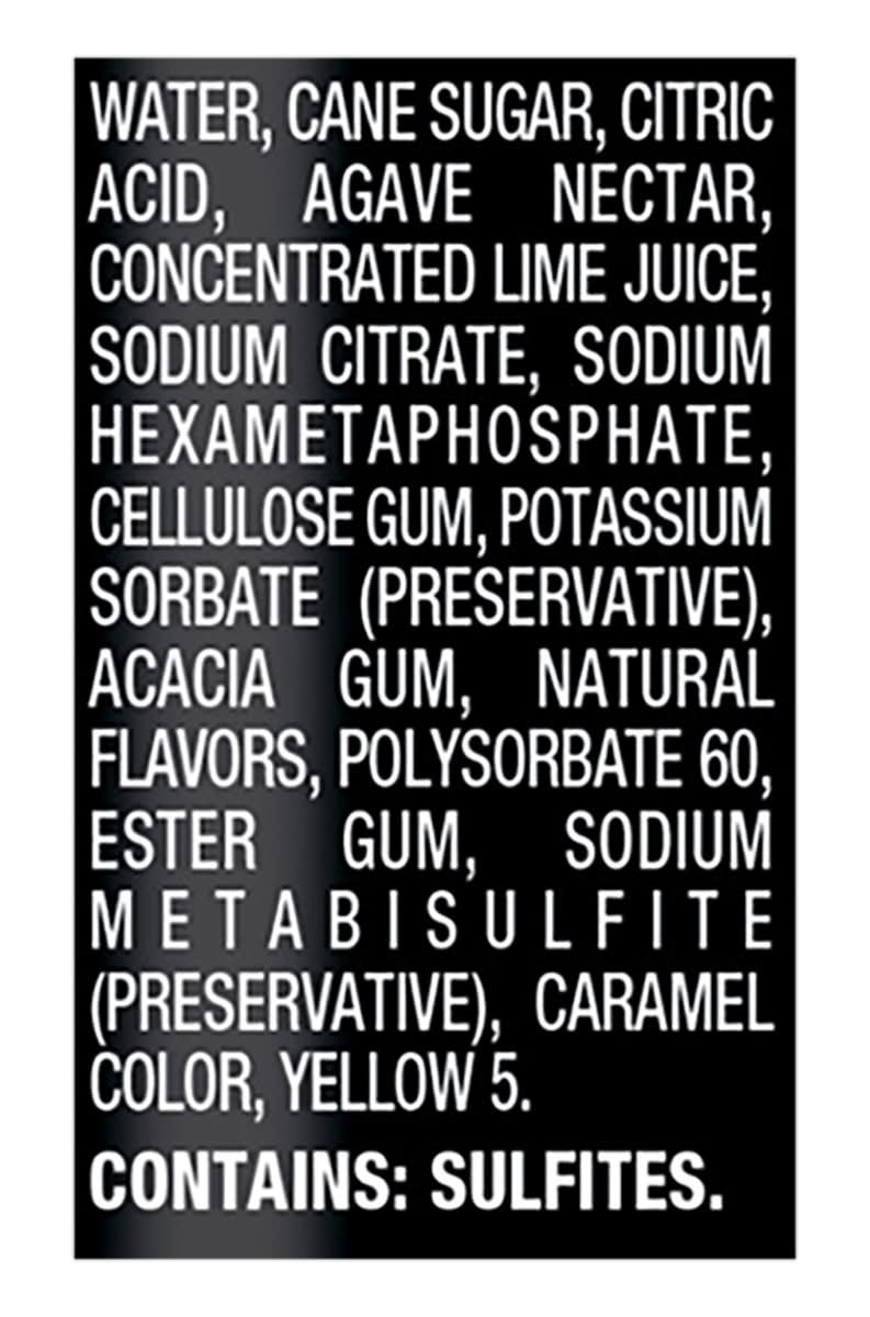 Ingredients: Water, Cane Sugar, Citric Acid, Agave Nectar, Concentrated Lime Juice, Sodium Citrate, Sodium Hexametaphosphate, Cellulose Gum, Potassium Sorbate (Preservative), Acacia Gum, Natural Flavors, Polysorbate 60, Ester Gum, Sodium Metabisulfite (Preservative), Caramel Color, Yellow 5 Contains: Sulfites