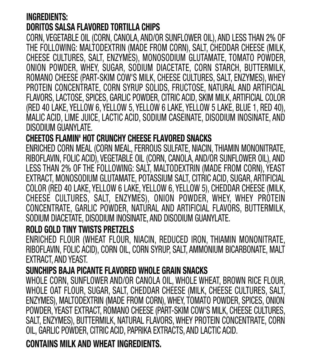 Ingredients: Corn, Vegetable Oil (Corn Canola Soybean and/or Sunflower Oil), Enriched Flour (Wheat Flour Niacin Reduced Iron Thiamin Mononitrate Riboflavin Folic Acid), Enriched Corn Meal (Corn Meal Ferrous Sulfate Niacin Thiamin Mononitrate Riboflavin Folic Acid), Whole Wheat, and Less Than 2% Of Brown Rice Flour, Salt, Whole Oat Flour, Sugar, Corn Syrup, Maltodextrin (Made From Corn), Cheddar Cheese (Milk Cheese Cultures Salt Enzymes), Onion Powder, Whey, Whey Protein Concentrate, Garlic Powder, Monosodium Glutamate, Buttermilk, Natural and Artificial Flavors, Tomato Powder, Romano Cheese (Cow's Milk Cheese Cultures Salt Enzymes), Spices, Yeast Extract, Sodium Diacetate, Corn Starch, Corn Syrup Solids, Fructose, Lactose, Citric Acid, Artificial Color (Red 40 Lake Yellow 6 Yellow 5 Yellow 5 Lake Yellow 6 Lake Blue 1 Red 40), Potassium Salt, Ammonium Bicarbonate, Yeast, Malt Extract, Disodium Inosinate, Disodium Guanylate, Lactic Acid, Skim Milk, Malic Acid, Lime Juice, and Sodium Caseinate Contains: Corn, Milk, Lactose, Wheat