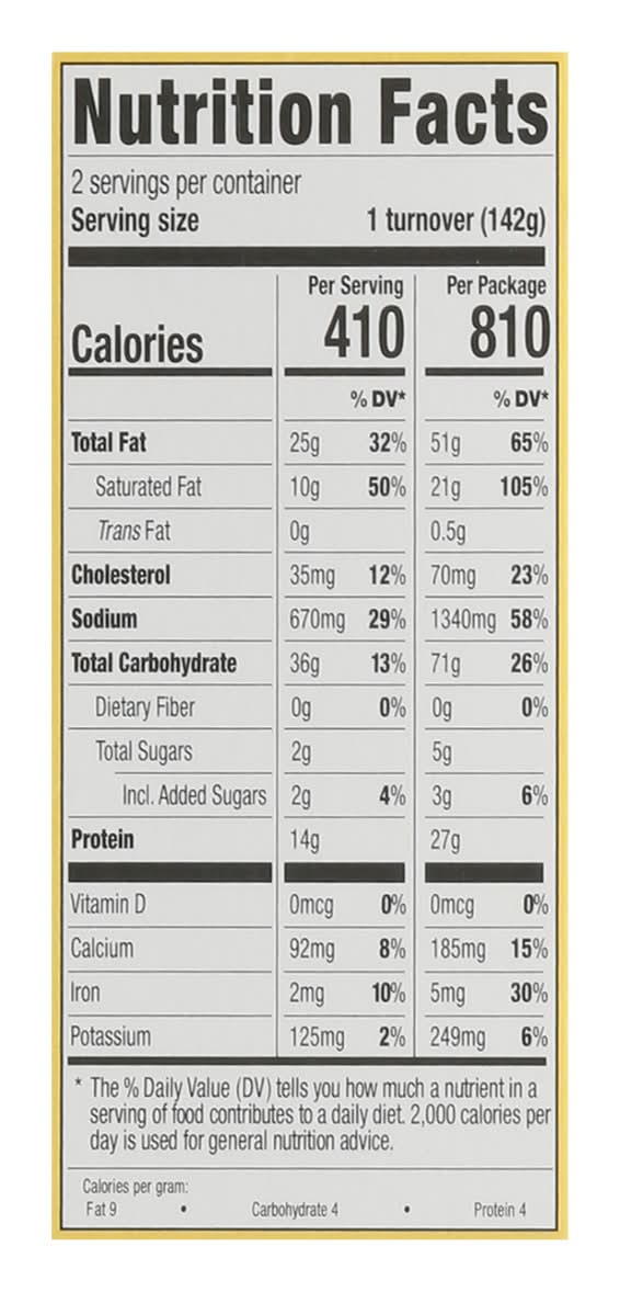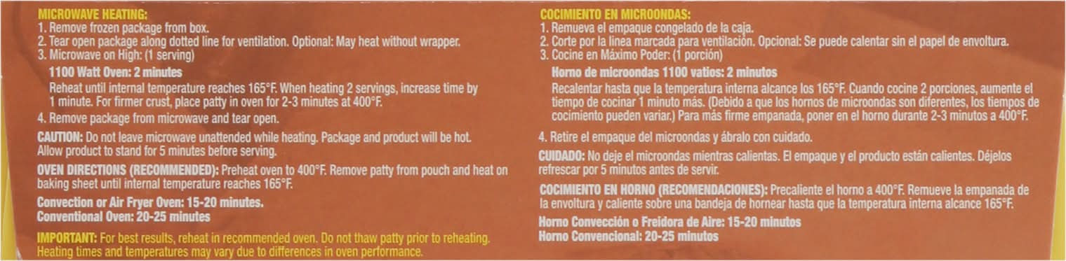 Ingredients: Filling: Ground Beef, Water, Cheddar Cheese [(Pasteurized Milk, Cheese Culture, Salt, Enzymes), Water, Milkfat, Sodium Phosphate, Sodium Hexametaphosphate, Salt, Artificial Color, with Cellulose Powder Added to Prevent Caking], Onions, Modified Food Starch, Bread Crumbs (Wheat Flour, Salt, Yeast), Seasoning [(Soup Base (Dextrose, Salt, Corn Starch, Hydrolyzed Vegetable Protein (Soybean), Natural Flavors, Onions, Spice Blend, Garlic, Caramel Color, Palm Oil), Salt, Flavoring), Monosodium Glutamate, Soy Sauce (Water, Soybeans, Wheat, Salt)], Hot Peppers, Caramel Color and Thyme. Crust: Enriched Unbleached Flour (Wheat Flour, Niacin, Reduced Iron, Thiamine Mononitrate, Riboflavin, Folic Acid), Water, Palm Oil, Sugar, Salt, Extractives of Turmeric and Annatto Contains: Wheat, Soybeans, Milk, Corn