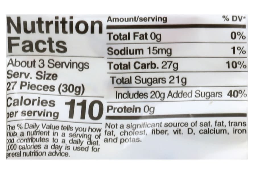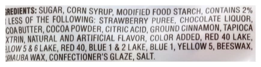 Ingredients: Sugar, Corn Syrup, Modified Food Starch, Contains 2% or Less of the Following: Strawberry Puree, Chocolate Liquor, Cocoa Butter, Cocoa Powder, Citric Acid, Ground Cinnamon, Tapioca, Dextrin, Natural and Artificial Flavor, Color Added, Red 40 Lake, Yellow 5 & 6 Lake, Red 40, Blue 1 & 2 Lake, Blue 1, Yellow 5, Beeswax, Carnauba Wax, Confectioner’s Glaze, Salt Contains: 'Free From Gluten', 'Free From Peanuts'