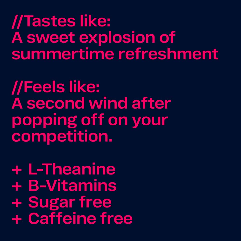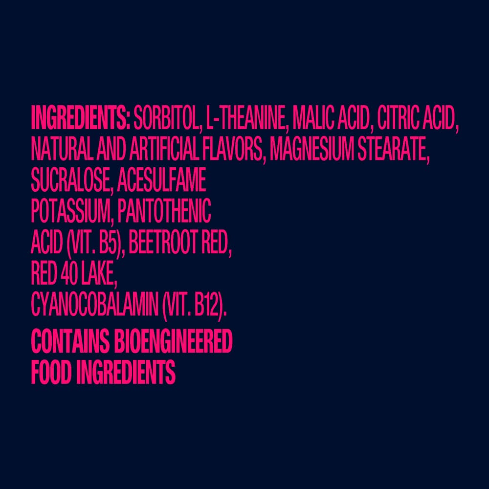 Ingredients: SORBITOL, L-THEANINE, MALIC ACID, CITRIC ACID, NATURAL AND ARTIFICIAL FLAVORS, MAGNESIUMSTEARATE, SUCRALOSE, ACESULFAME POTASSIUM, PANTOTHENIC ACID (VIT. B5), BEETROOT RED, RED 40 LAKE, CYANOCOBALAMIN (VIT. B12).