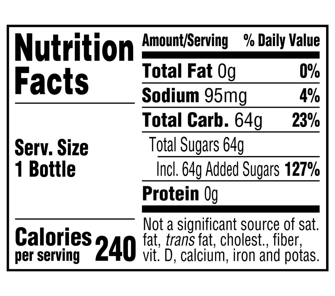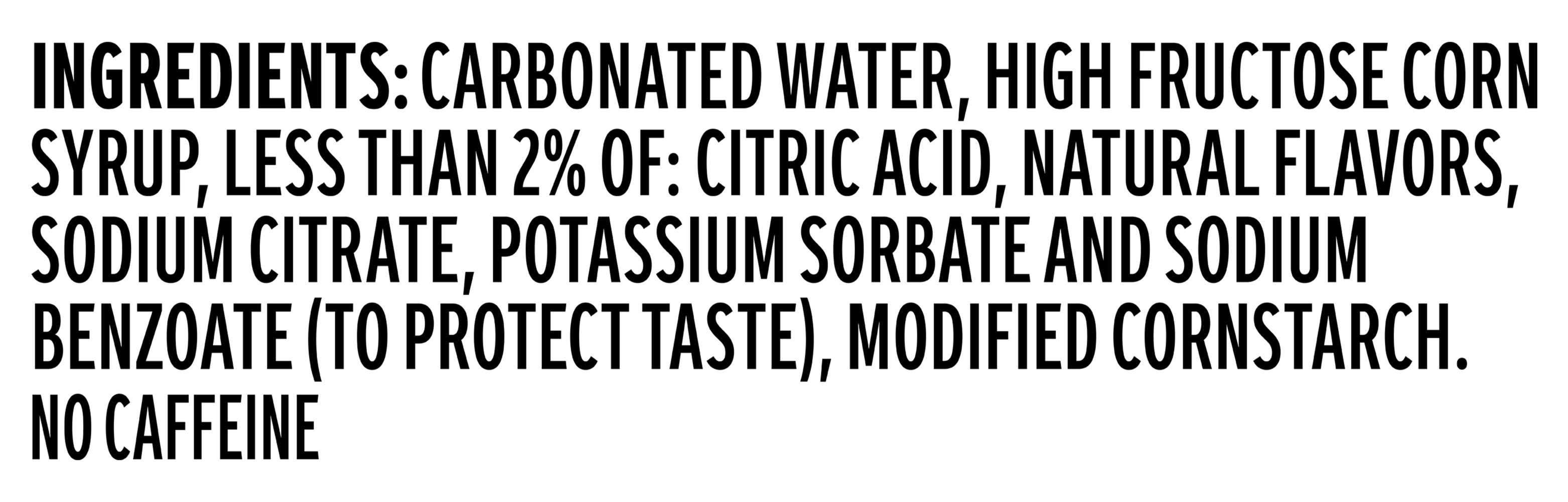 Ingredients: Carbonated Water, High Fructose Corn Syrup, Less Than 2% Of: Citric Acid, Natural Flavors, Sodium Citrate, Potassium Sorbate And Sodium Benzoate (To Protect Taste), Modified Cornstarch.