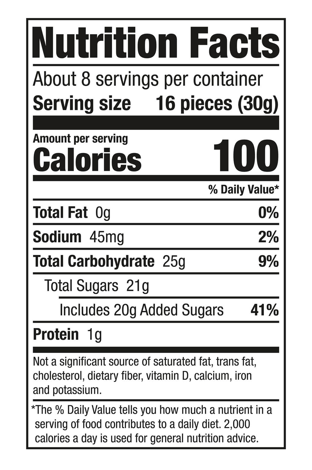 Ingredients: Corn Syrup, Sugar, Dextrose, Gelatin, Modified Food Starch, Water, Contains 2% or Less of Malic Acid (DL-Malic Acid), Citric Acid, Sodium Citrate, Apple Juice Concentrate, Gum Arabic, Natural and Artificial Flavors, Carnauba Wax, Color Added, Blue 1, Red 40, Red 40 Lake, Blue 2 Lake, Carmine (Color), Blue 1 Lake, Yellow 5 Lake Contains: Milk, Eggs, Tree Nuts, Peanuts, Wheat, Soybeans