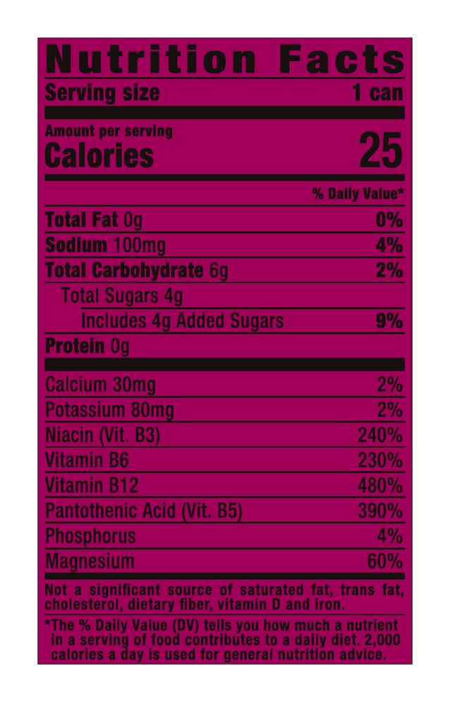 Caffeine from all sources: 160mg per can. Electrolytes NA.K.Ca.Mg. B3;B6: Vitamins B3; B5; B6; B12. Refresh + recover + relieve. Advanced hydration. Reduced fatigue. Increased concentration. Coconut water. Non-carbonated. • Brand: Monster energy • Flavor: Wild berry tea
