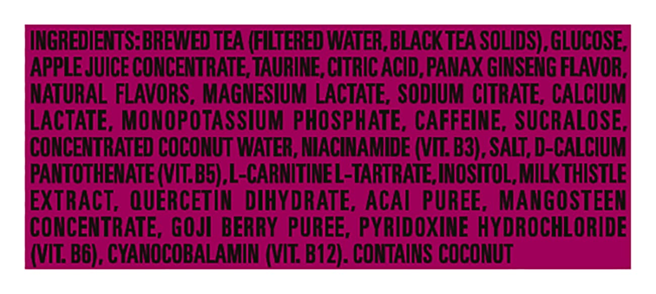 Ingredients: Brewed Tea (Filtered Water, Black Tea Solids), Glucose, Apple Juice Concentrate, Taurine, Citric Acid, Panax Ginseng Flavor, Natural Flavors, Magnesium Lactate, Sodium Citrate, Calcium Lactate, Monopotassium Phosphate, Caffeine, Sucralose, Concentrated Coconut Water, Niacinamide (Vit. B3), Salt, D-Calcium Pantothenate (Vit.B5), L-Carnitine L-Tartrate, Inositol, Milk Thistle Extract, Quercetin Dihydrate, Acai Puree, Mangosteen Concentrate, Goji Berry Puree, Pyridoxine Hydrochloride (Vit. B6), Cyanocobalamin (Vit. B12), Monster Rehab Energy Blend: Glucose, Taurine, Caffeine, L-Carnitine, Inositol Contains: Tree Nuts, Coconuts