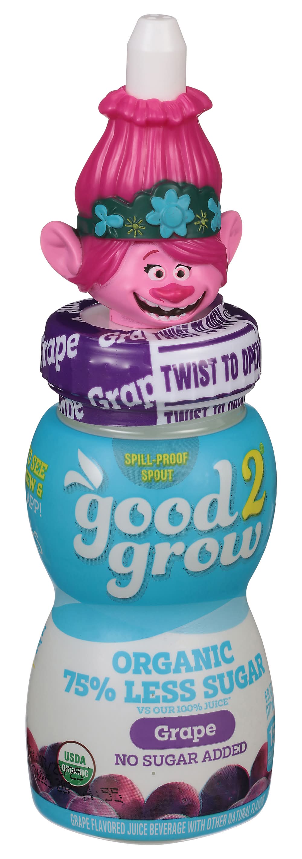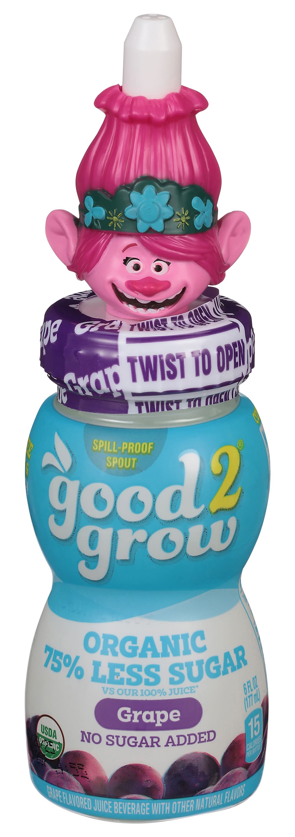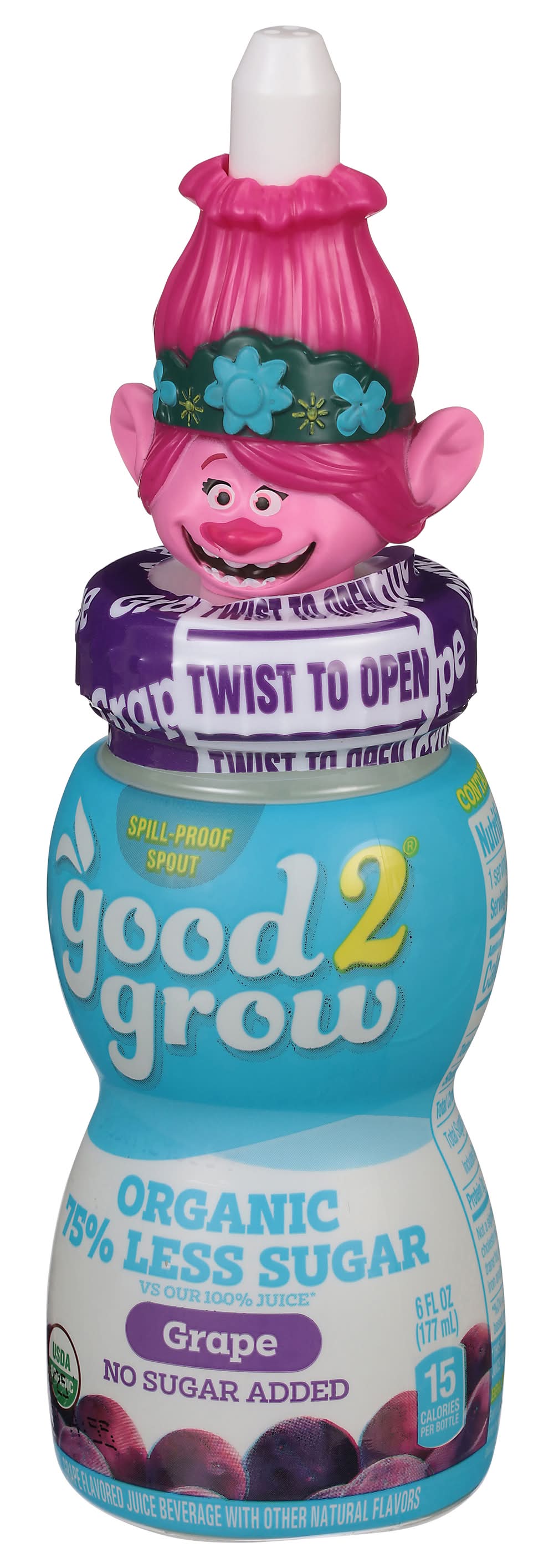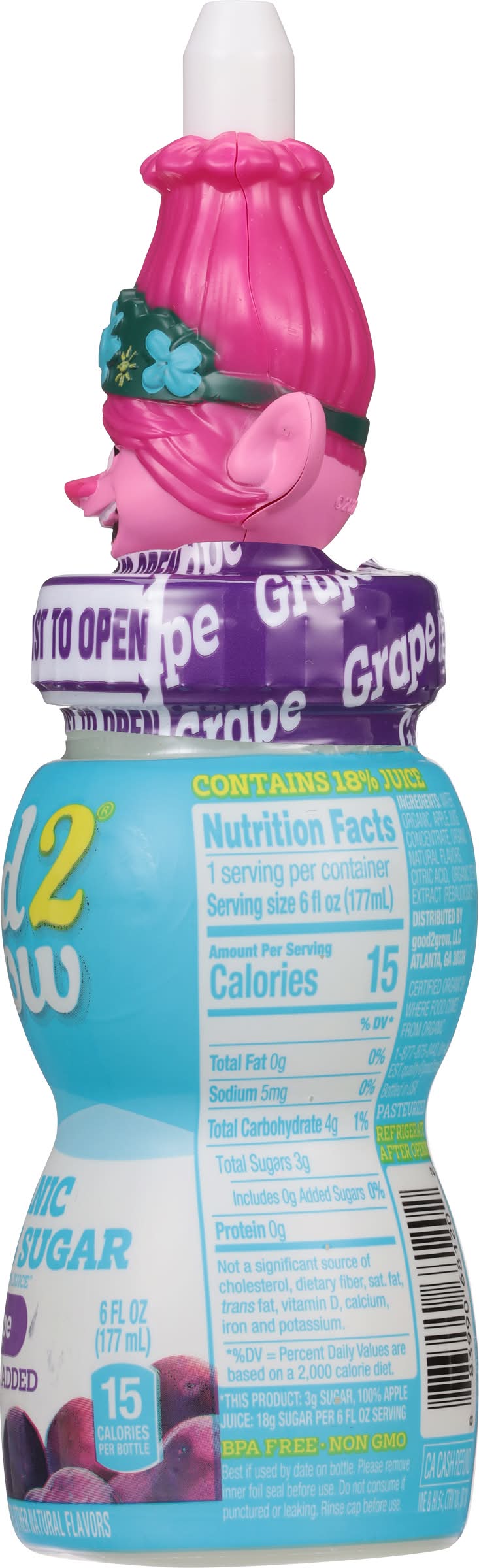 Grape flavored juice beverage with other natural flavors. No artificial flavors. 15 calories per bottle. This Product: 3 g sugar, 100% apple juice: 18 g sugar per 6 fl oz serving. USDA Organic. Certified Organic by International Certification Services, Inc. No sugar added. 75% less sugar vs. our 100% juice. Non GMO. Spill proof spout. No artificial colors. No artificial preservatives. Pasteurized. • Brand: Good2grow • Flavor: Grape • organic, GMO-free • Good2grow, Atlanta,GA,30339