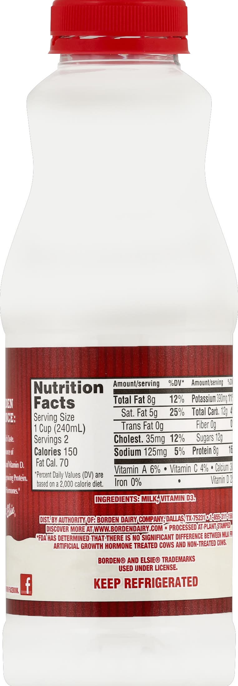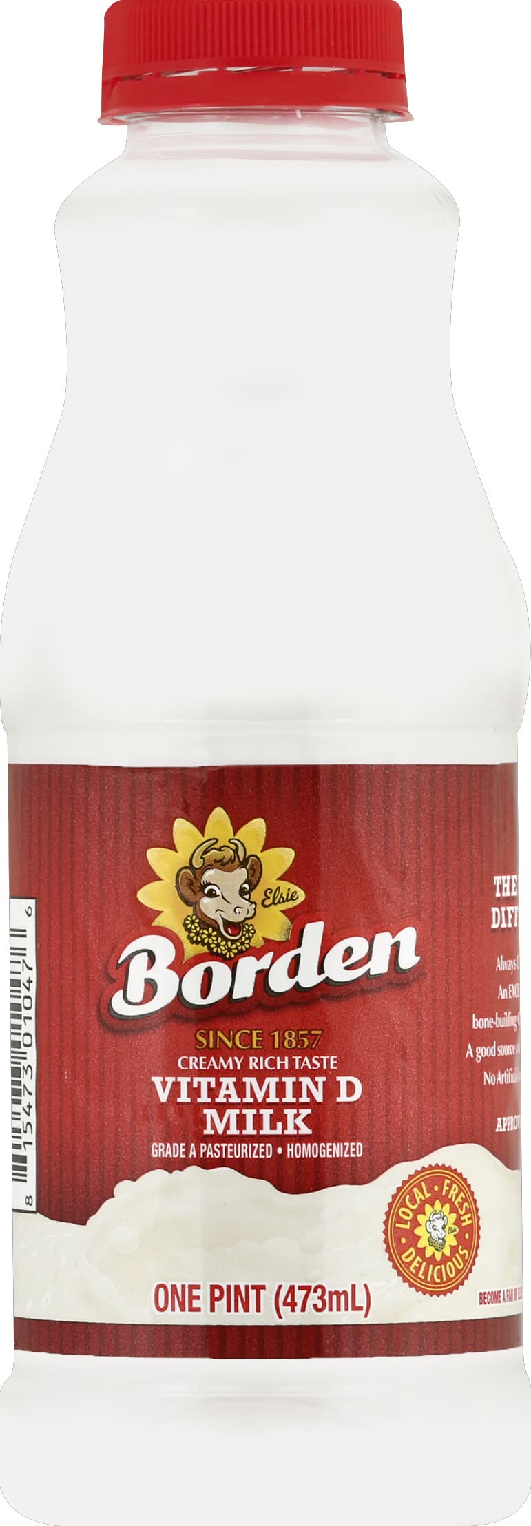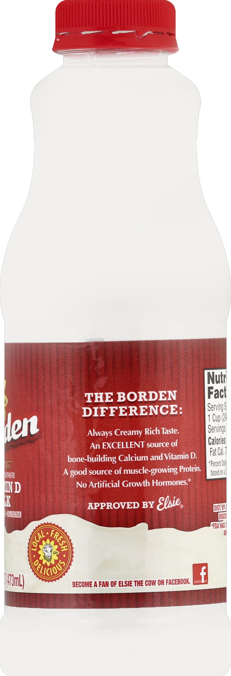 Since 1857. Creamy rich taste. Grade A pasteurized. Homogenized. Local. Fresh. Delicious. Discover more at www.bordendairy.com. The Borden Difference: Always creamy rich taste. An excellent source of bone-building calcium and vitamin D. A good source of muscle-growing protein. No artificial growth hormone (FDA has determined that there is no significant difference between milk from artificial growth hormone treated cows and non-treated cows.). Approved by Elsie. • Brand: Borden • kosher • Borden, Dallas, TX 75231,