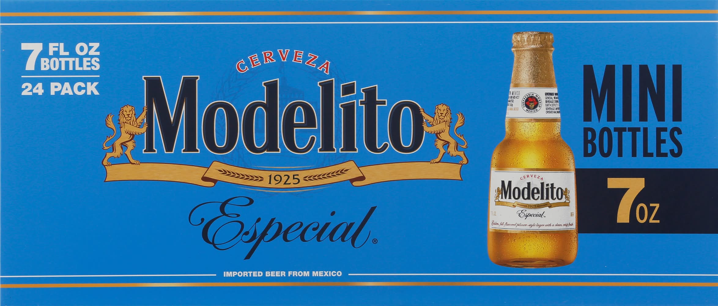 Modelito Especial Mexican Beer is a rich, full-flavored pilsner beer; it's authentic Modelo in small beer bottles. This bottled beer's aroma and light-hop character make it a perfect tailgating beer. • Brand: Modelo • Pack size: 24 • Alcohol by volume: 4.4% • Tasting notes: grainy, light, malty • Food pairing: beef, nuts • Suggested glassware: pint glass