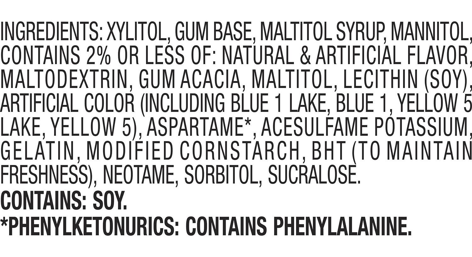 Ingredients: XYLITOL, GUM BASE, MALTITOL SYRUP, MANNITOL, CONTAINS 2% OR LESS OF: NATURAL ARTIFICIAL FLAVOR, MALTODEXTRIN, GUM ACACIA, MALTITOL, LECITHIN (SOY), ARTIFICIAL COLOR (INCLUDING BLUE 1 LAKE, BLUE 1, YELLOW 5 LAKE, YELLOW 5), ASPARTAME*, ACESULFAME POTASSIUM, GELATIN, MODIFIED CORNSTARCH, BHT (TO MAINTAIN FRESHNESS), NEOTAME, SORBITOL, SUCRALOSE. Contains: Contains: Soy