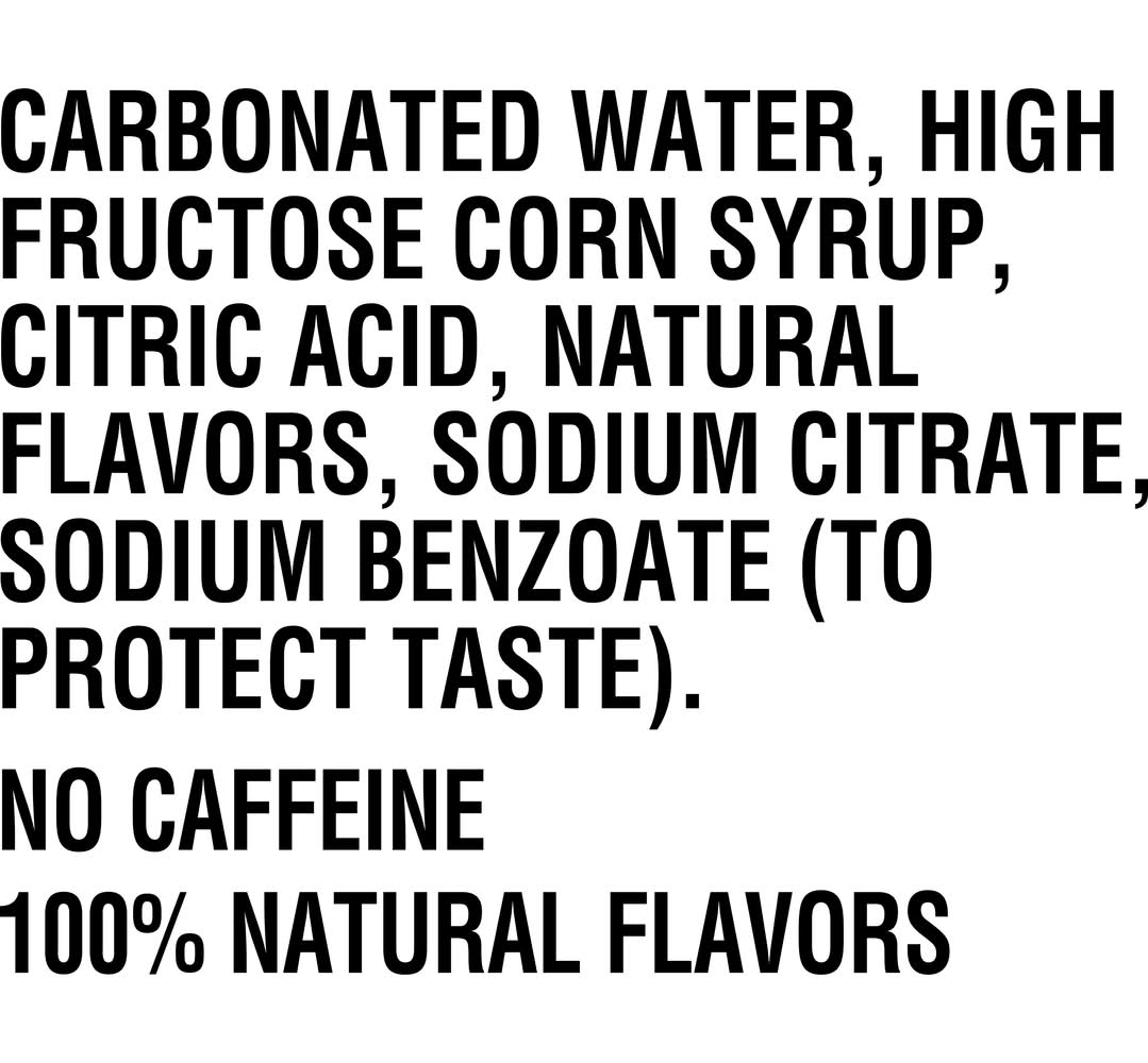 Ingredients: Carbonated Water, High Fructose Corn Syrup, Citric Acid, Natural Flavors, Sodium Citrate, Sodium Benzoate (To Protect Taste). Contains: Corn