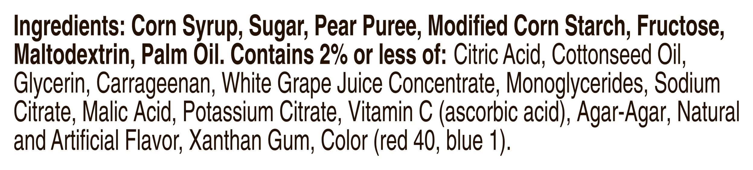 Ingredients: Corn Syrup, Sugar, Pear Puree, Modified Corn Starch, Fructose, Maltodextrin, Palm Oil, Contains 2% or Less of: Citric Acid, Cottonseed Oil, Glycerin, Carrageenan, White Grape Juice Concentrate, Monoglycerides, Malic Acid, Potassium Citrate, Vitamin C (Ascorbic Acid), Natural and Artificial Flavor, Xanthan Gum, Color (Red 40, Blue 1)