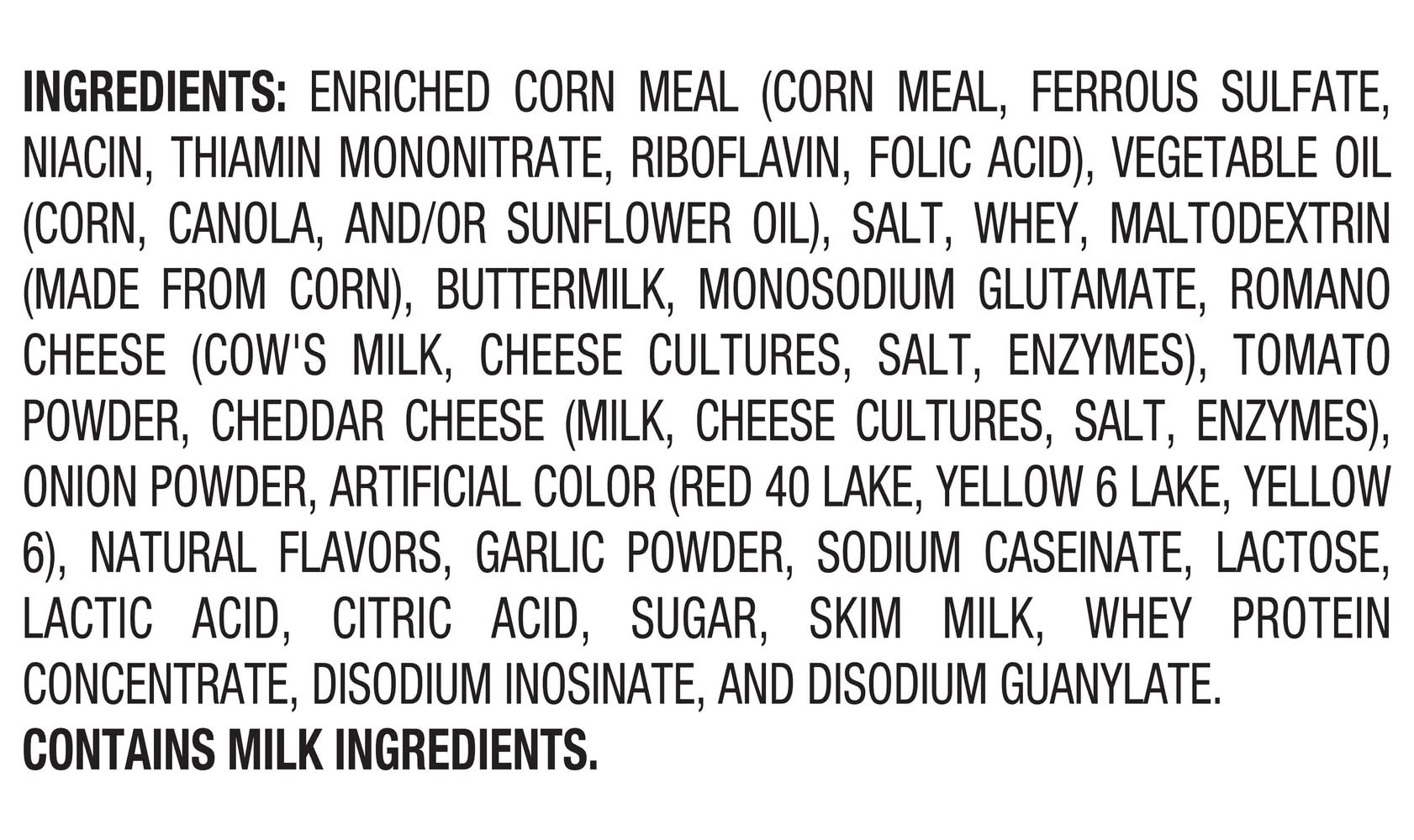 Ingredients: Enriched Corn Meal (Corn Meal, Ferrous Sulfate, Niacin, Thiamin Mononitrate, Riboflavin, Folic Acid), Vegetable Oil (Corn, Canola, And/Or Sunflower Oil), Salt, Whey, Maltodextrin (Made From Corn), Buttermilk, Monosodium Glutamate, Romano Cheese (Cow'S Milk, Cheese Cultures, Salt, Enzymes), Tomato Powder, Cheddar Cheese (Milk, Cheese Cultures, Salt, Enzymes), Onion Powder, Artificial Color (Red 40 Lake, Yellow 6 Lake, Yellow 6), Natural Flavors, Garlic Powder, Sodium Caseinate, Lactose, Lactic Acid, Citric Acid, Sugar, Skim Milk, Whey Protein Concentrate, Disodium Inosinate, And Disodium Guanylate. CONTAINS MILK INGREDIENTS. Contains: Contains Milk Ingredients.