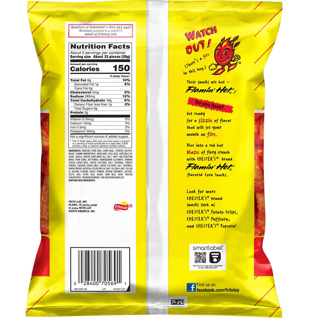 Each bite delivers a sizzle of Flamin' Hot seasoning for those who enjoy snacks with a spicy kick. These corn-based snacks are gluten-free and invite snack lovers to explore the intensity of a red hot taste sensation. • Brand: Chester's • Flavor: Flamin hot • Frito-Lay, Inc., Plano, TX, 75024