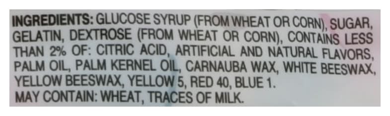 Ingredients: Glucose Syrup (from Wheat or Corn), Sugar, Gelatin, Dextrose (from Wheat or Corn), Contains Less than 2% of: Citric Acid, Artificial and Natural Flavors, Palm Oil, Palm Kernel Oil, Carnauba Wax, White Beeswax, Yellow Beeswax, Yellow 5, Red 40, Blue 1 Contains: Wheat, Milk