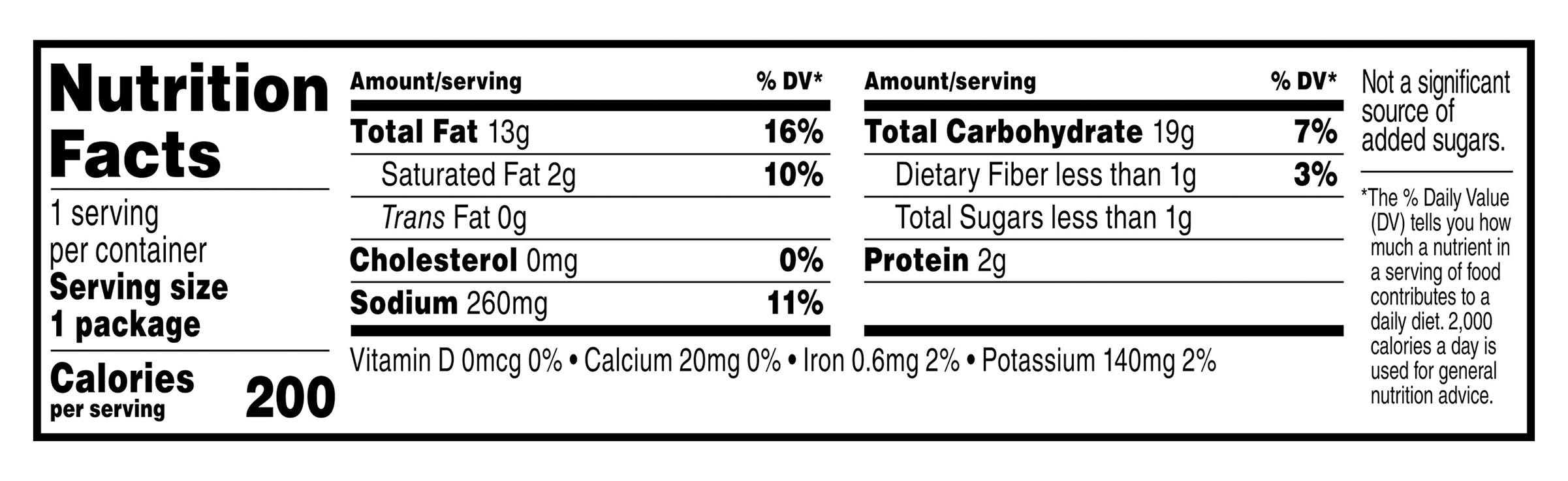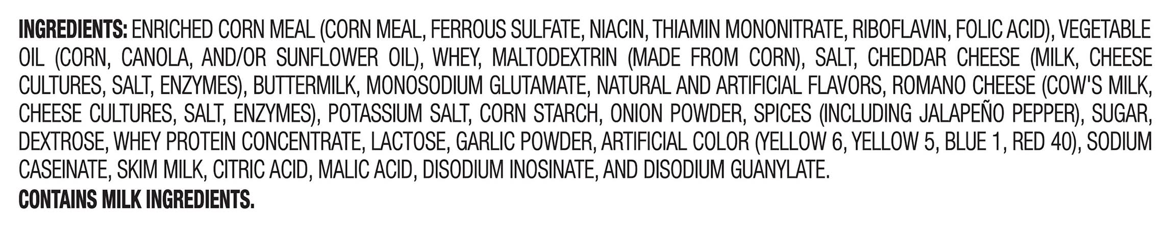 Ingredients: Enriched Corn Meal (Corn Meal, Ferrous Sulfate, Niacin, Thiamin Mononitrate, Riboflavin, Folic Acid), Vegetable Oil (Corn, Canola, and/or Sunflower Oil), Whey, Maltodextrin (Made from Corn), Salt, Cheddar Cheese (Milk, Cheese Cultures, Salt, Enzymes), Buttermilk, Monosodium Glutamate, Natural and Artificial Flavors, Romano Cheese (Cow's Milk, Cheese Cultures, Salt, Enzymes), Potassium Salt, Corn Starch, Onion Powder, Spices (Including Jalapeno Pepper), Sugar, Dextrose, Whey Protein Concentrate, Lactose, Garlic Powder, Artificial Color (Yellow 6, Yellow 5, Blue 1, Red 40), Sodium Caseinate, Skim Milk, Citric Acid, Malic Acid, Disodium Inosinate, and Disodium Guanylate Contains: Milk, Lactose