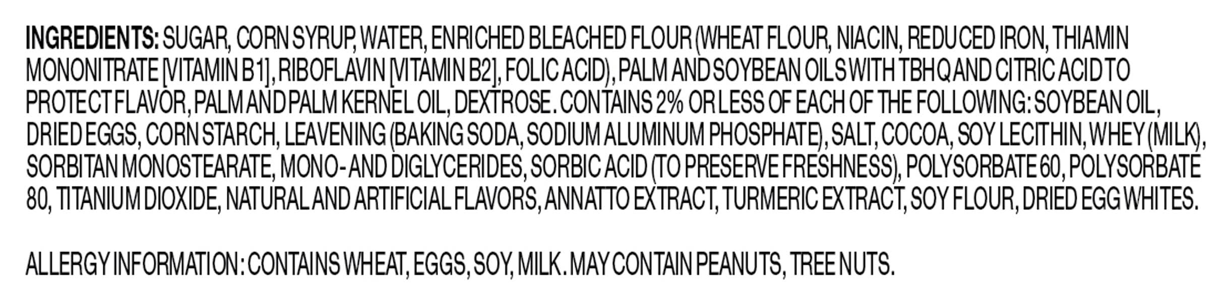 Ingredients: Sugar, Corn Syrup, Water, Enriched Bleached Flour (Wheat Flour, Niacin, Reduced Iron, Thiamin Mononitrate [Vitamin B1], Riboflavin [Vitamin B2], Folic Acid), Palm and Soybean Oils with TBHQ and Citric Acid to Protect Flavor, Palm and Palm Kernel Oil, Dextrose. Contains 2% or Less of Each of the Following: Soybean Oil, Dried Eggs, Corn Starch, Leavening (Baking Soda, Sodium Aluminum Phosphate), Salt, Cocoa, Soy Lecithin, Whey (Milk), Sorbitan Monostearate, Mono- and Diglycerides, Sorbic Acid (to Preserve Freshness), Polysorbate 60, Titanium Dioxide (Color), Natural and Artificial Flavors, Annatto Extract (Color), Turmeric Extract (Color), Soy Flour, Dried Egg Whites Contains: Wheat, Soybeans, Eggs, Milk, Peanuts, Tree Nuts