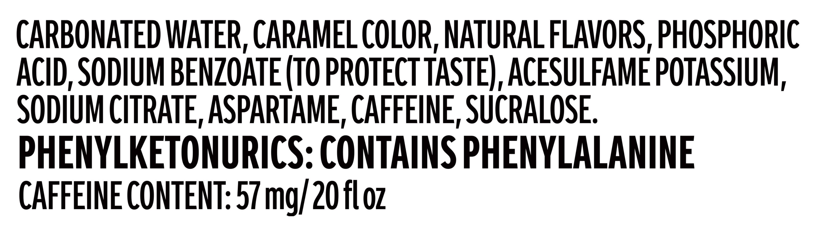 Ingredients: Carbonated Water Caramel Color Natural Flavors Phosphoric Acid, Sodium Benzoate (to Protect Taste) Acesulfame Potassium Sodium Citrate, Aspartame Caffeine Sucralose.