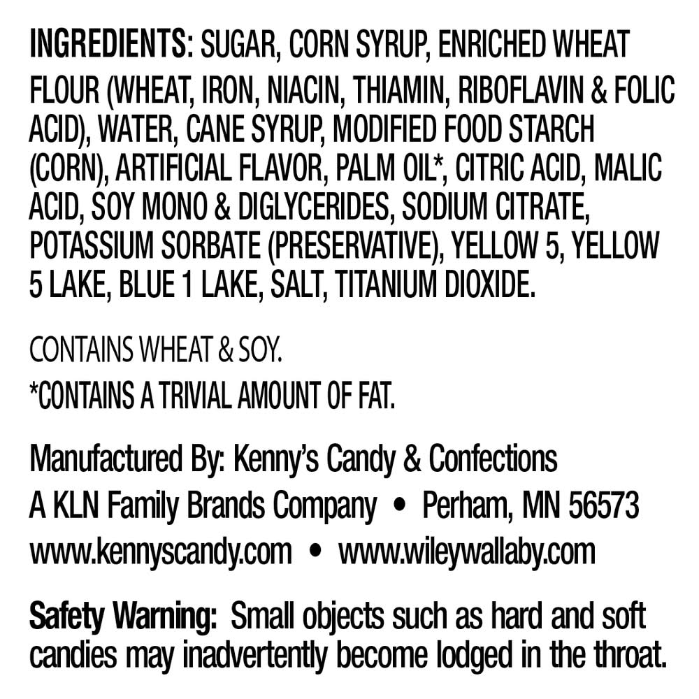 Ingredients: Sugar, Corn Syrup, Enriched Wheat Flour (Wheat, Iron, Niacin, Thiamin,,Riboflavin & Folic Acid), Water, Cane Syrup, Modified Food Starch (Corn), Artificial Flavor, Palm, Oil, Citric Acid, Malic Acid, Soy Mono- & Diglycerides, Sodium Citrate, Potassium Sorbate, Preservative), Artificial Colors (Fd&C Yellow No. 5, Fd&C Yellow No. 5 Lake, Fd&C Blue No. 1,Lake), Salt, Titanium Dioxide Contains: Wheat and Their Derivatives, Soybean and its Derivatives
