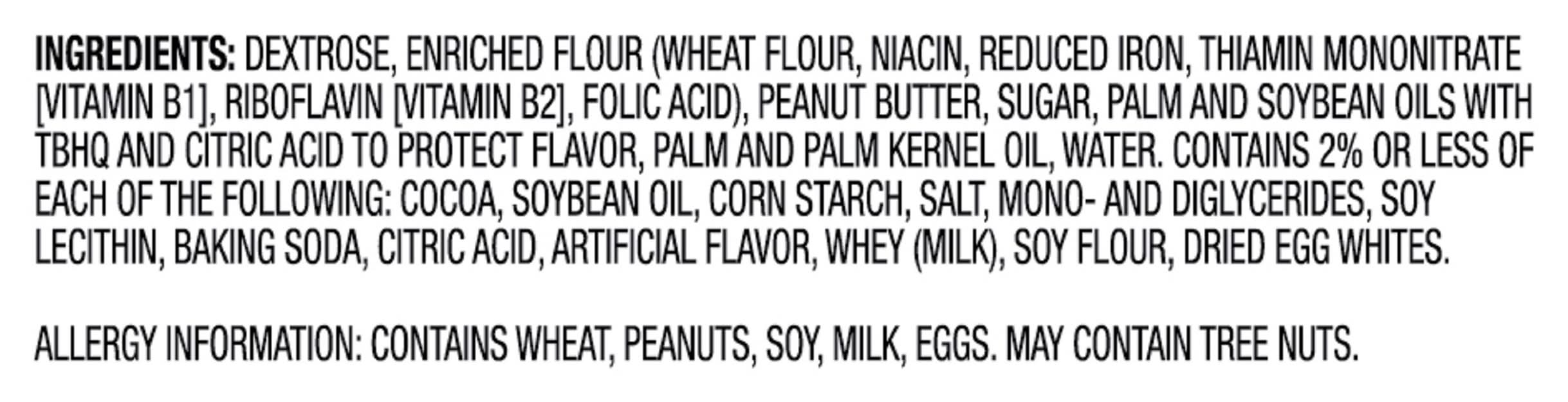 Ingredients: Dextrose, Enriched Flour (Wheat Flour, Niacin, Reduced Iron, Thiamin Mononitrate [Vitamin B1], Riboflavin [Vitamin B2], Folic Acid), Peanut Butter, Sugar, Palm and Soybean Oils with TBHQ and Citric Acid to Protect Flavor, Palm and Palm Kernel Oil, Water, Contains 2% or Less of Each of the Following: Cocoa, Soybean Oil, Corn Starch, Salt, Mono- and Diglycerides, Soy Lecithin, Baking Soda, Citric Acid, Artificial Flavor, Whey (Milk), Soy Flour, Dried Egg Whites Contains: Wheat, Peanuts, Soybeans, Milk, Eggs, Tree Nuts