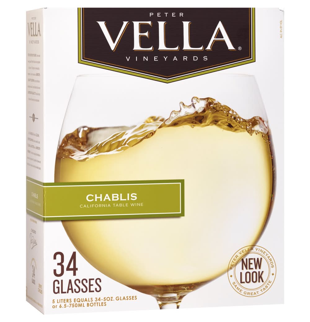 California table wine. 34 glasses. 5 liters equals 34 - 5 oz glasses or 6.5 - 750 ml bottles. New look. Same great taste. For over 50 years I have made every glass of Peter Vella as enjoyable as the last. Through my winemaking expertise, I craft my delicious blush in smooth, easy-to-drink style that offers an exceptional value. I stand behind this product's superior quality and know that its taste will exceed your expectations. Our Chablis offers a clean, refreshing taste accented by soft floral notes and a smooth finish. This wine is equally delectable at home on the patio with a platter of cheese and fresh fruit, or next to a serving of seafood pasta. Cheers! Peter Vella. Welcome to Peter Vella Vineyards, where we place quality and taste above all else. As a third generation winemaker, the California wine country has always been a part of my life. My father and grandfather worked hard to perfect the art of winemaking and I've been proud to carry on their tradition for more than 50 years. I am committed to bringing you the best quality products, created in a smooth, approachable style, at an affordable everyday price. From my family to yours, please enjoy! Cheers! Peter Vella. From my family to yours, quality & expertise. Elderberry extract added. Alc. 9.5% by vol. Vinted & packed by Peter Vella Wines, Modesto, CA. • Brand: Peter vella • Alcohol by volume: 9.5%