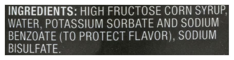 Ingredients: High Fructose Corn Syrup, Water, Potassium Sorbate and Sodium Benzoate (to Protect Flavor), Sodium Bisulfate. Contains: 'Free From Gluten'