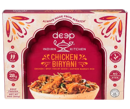 Ingredients: Chicken Biryani - Water, White Meat Chicken, Yogurt (Pasteurized Cultured Grade A Milk, Nonfat Dry Milk, Milk Protein, Active Yogurt And Probiotic Cultures), Basmati Rice, Fried Onions (Onions, Palm Oil, Buckwheat, Salt), Expeller-Pressed Canola Oil, Spices, Green Peas, Lemon Juice (Water, Concentrated Lemon Juice), Carrots, Garlic, Ghee (Clarified Butter), Onions, Salt, Mint, Potato Starch, Syrup Blend (Rice Syrup, Grape Juice), Sugar, Turmeric, Paprika Oleoresin, Vinegar, Fenugreek Leaves, Pomegranate Powder, Mango Powder, Onion Seeds, Saffron