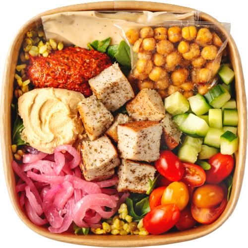 Enjoy the fresh flavors of the Mediterranean in a grab-and-go meal. Cubed no antibiotics, ever chicken breast, crisp cucumber, juicy tomatoes and seasoned corn are set on turmeric-seasoned whole grains. Sauce and season to taste with seed-oil-free harissa, lemon tahini and crispy cooked garbanzo beans, each packaged separately for ultimate freshness. Remove garbanzo and sauce pouches, pour over bowl, mix contents and enjoy Some ingredients may be substituted or unavailable as these are made fresh in house.