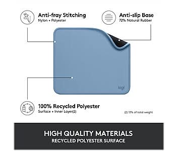 Glide in Style and Comfort — The Logitech Studio Series Mouse Pad Combines Smooth Performance, Spill Resistance, and Sustainable Design The Logitech Studio Series mouse pad is a soft, smooth, nonslip mouse pad that lets you glide away with your favorite Logitech mouse. The fine weave cuts the friction, so your mouse glides effortlessly and silently, while the spill-proof coating withstands accidental mishaps. The rubber anti-slip base prevents sliding on any surface, keeping a firm hold on your desk no matter what. Fresh color and modern design make it the perfect accessory for your Logitech mouse. - Soft mouse pad for comfortable and effortless gliding - Anti-slip base features natural rubber, while the soft, comfortable surface fabric and inner layer are made of recycled polyester; comes in blue gray - Dimensions: 7.9 x 9.1 - Thickness: 0.08 in the rubber base - Features a spill-proof coating that withstands accidental mishaps, so liquids can easily be wiped away with a damp cloth - Smooth, comfortable cloth surface with a fine weave for effortless, silent gliding on any surface whether in the office or at home - Features anti-fraying flat-stitched edges - Made to compliment your Logitech mouse and other accessories - 2-Year Limited Hardware Warranty