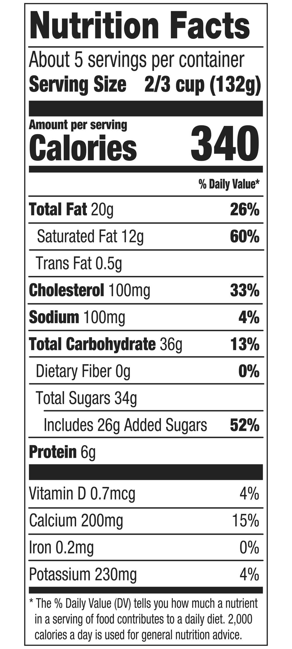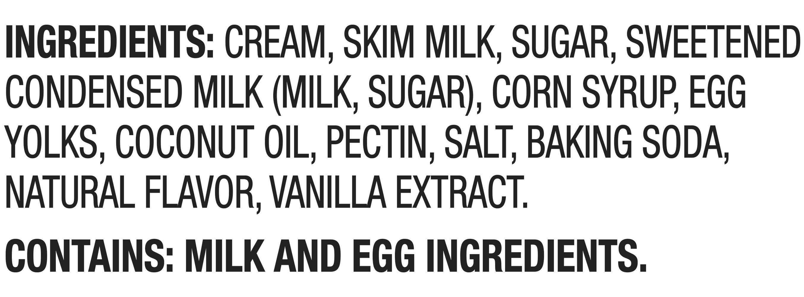 Ingredients: CREAM, SKIM MILK, SUGAR, SWEETENED CONDENSED MILK (MILK, SUGAR), CORN SYRUP, EGG YOLKS, COCONUT OIL, PECTIN, SALT, BAKING SODA, NATURAL FLAVOR, VANILLA EXTRACT. Contains: Milk, Eggs, Tree Nuts, Soybeans