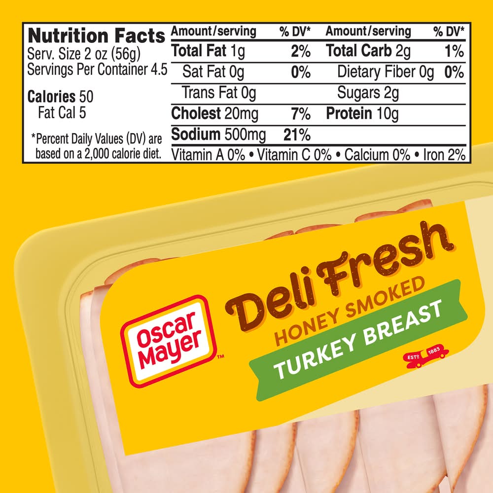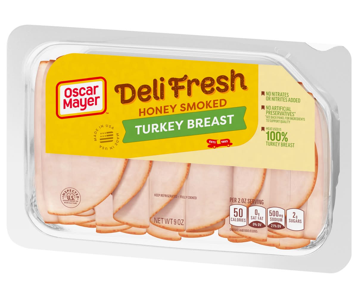 Make a delicious deli sandwich at home with Oscar Mayer Deli Fresh Honey Smoked Turkey Breast Sliced Lunch Meat. Our quality turkey deli meat is 98% fat-free and made with no artificial preservatives, no added hormones, and no added nitrates or nitrites. See back panel for ingredients to support quality. Fully cooked and ready to eat, our turkey slices have a mouthwatering smoky flavor with a touch of sweet honey that's perfect for a classic turkey sandwich, salad, or cheese and crackers. Keep our 9-ounce package of deli turkey refrigerated to maintain freshness. If you enjoy our honey smoked deli turkey, be sure to try the other varieties of Oscar Mayer turkey lunch meat. Kraft Heinz Foods Company, Chicago, IL, 60601