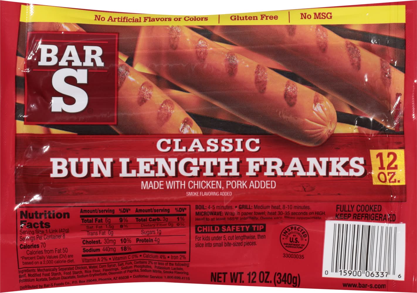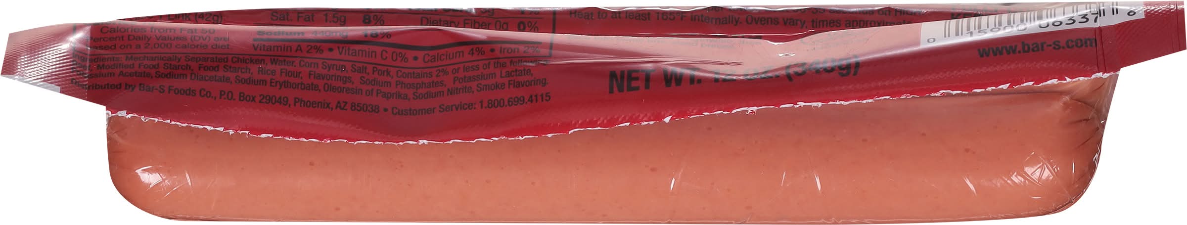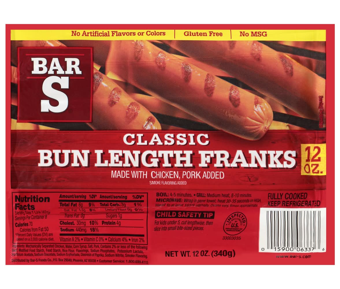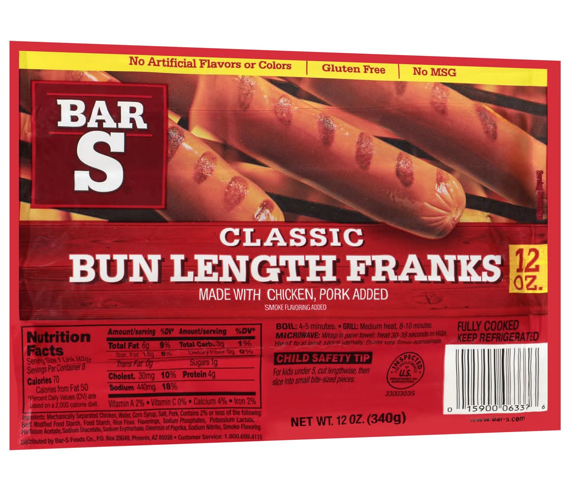 Made with chicken, pork added. Smoke flavor added. Bar-S Foods Co., PO Box 29049, Phoenix, AZ, 85038