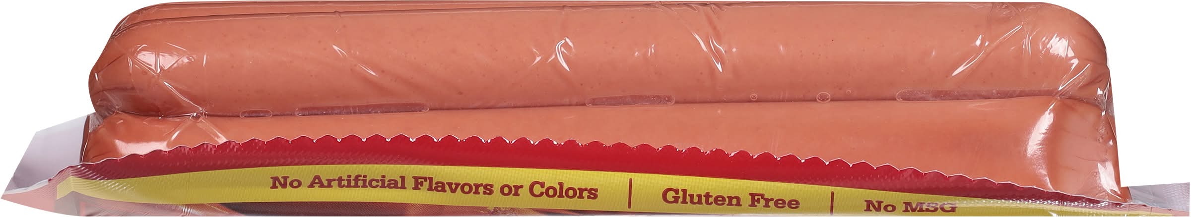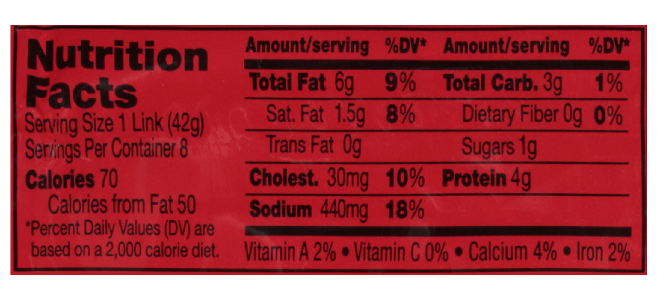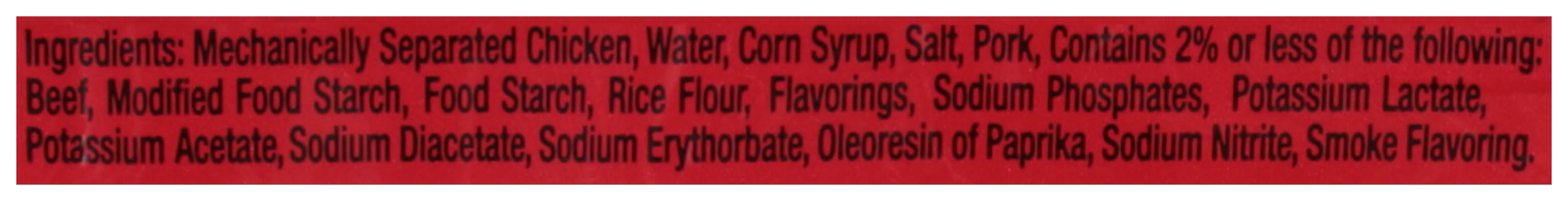 Ingredients: Mechanically Separated Chicken, Water, Corn Syrup, Salt, Pork, Contains 2% or Less of the Following: Beef, Modified Food Starch, Food Starch, Rice Flour, Flavorings, Sodium Phosphates, Potassium Lactate, Potassium Acetate, Sodium Diacetate, Sodium Erythorbate, Oleoresin of Paprika, Sodium Nitrite, Smoke Flavoring