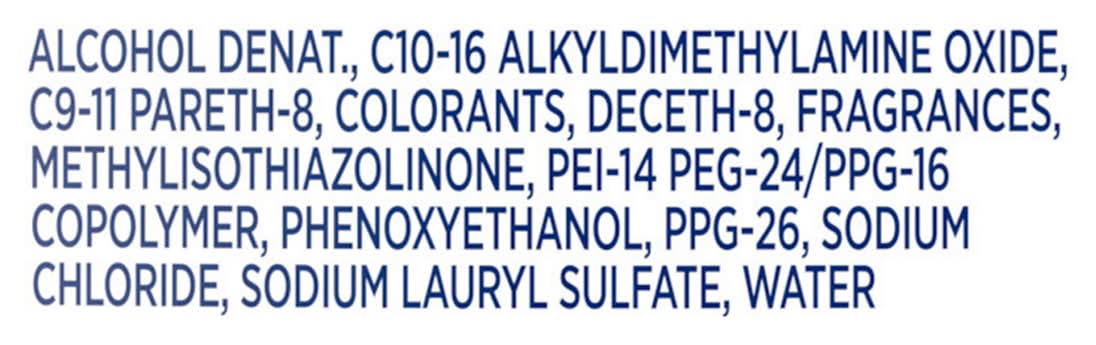 Ingredients: Alcohol Denat, C10-16 Alkyldimethylamine Oxide, C9-11 Pareth-8, Colorants, Deceth-8, Fragrances, Methylisothiazolinone, PEI-14 PEG-24/PPG-16 Copolymer, Phenoxyethanol, PPG-26, Sodium Chloride, Sodium Lauryl Sulfate, Water