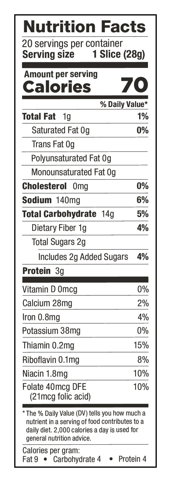 Each serving, which is one slice, contains calories and is free from artificial colors or flavors. This bread is a low-fat option that serves as an excellent source of energy-providing complex carbohydrates. It is also a nourishing source of several B vitamins, including thiamin, niacin, riboflavin, and folate, which are essential for and proper nervous system function. It is important to note that the product includes a bioengineered food ingredient. • Number of servings: 22 • Packaging: Reusable
