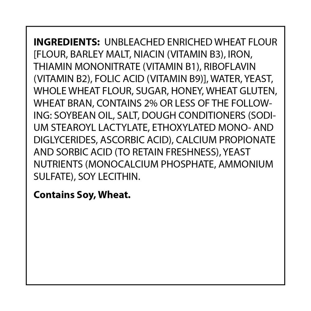 Ingredients: UNBLEACHED ENRICHED WHEAT FLOUR [FLOUR, BARLEY MALT, NIACIN (VITAMIN B3), IRON, THIAMIN MONONITRATE (VITAMIN B1), RIBOFLAVIN (VITAMIN B2), FOLIC ACID (VITAMIN B9)], WATER, YEAST, WHOLE WHEAT FLOUR, HONEY, WHEAT GLUTEN, WHEAT BRAN, CONTAINS 2% OR LESS OF THE FOLLOWING: SOYBEAN OIL, SALT, DOUGH CONDITIONERS (CONTAINS ONE OR MORE OF THE FOLLOWING: ETHOXYLATED MONO AND DIGLYCERIDES, SODIUM STEAROYL LACTYLATE, ASCORBIC ACID), YEAST NUTRIENTS (MONOCALCIUM PHOSPHATE, AMMONIUM SULFATE), SOY LECITHIN.CONTIANS: WHEAT, SOY. Contains: Contains soy, wheat.<br />Allergy Advisory: Produced on the same bakery equipment as baked goods containing milk, eggs, nuts or seeds. Therefore, this product may inadvertently contain milk, eggs, nuts or seeds to which some people may be allergic.