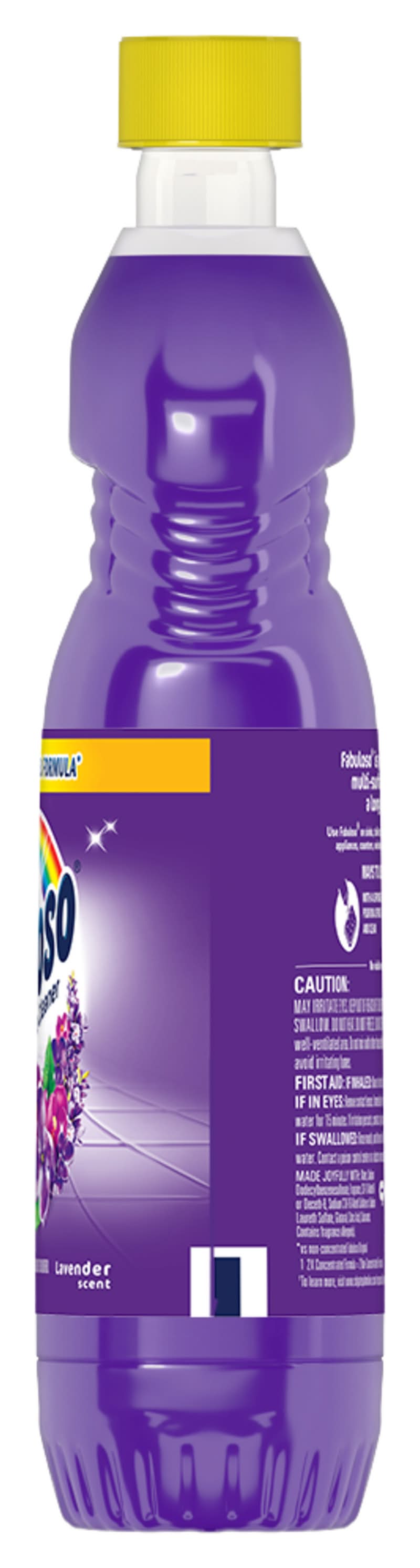 Multi-Purpose Cleaner, 2X Concentrated Formula in Lavender Scent transforms your home with a fresh scent that lasts. Bring the fragrance of lavender indoors, and experience a warm, joyful feeling your friends and family will love. 2X Concentrated Formula now provides 2X more active ingredients compared to non-concentrated Fabuloso Original, giving you 2X the dosage in the same bottle. Every colorful pour from the easy-pour bottle delivers a long-lasting, unmistakable freshness and leaves your home bright and clean. Use Multi-Purpose Cleaner, on sinks, toilets, tubs, showers, kitchen and bathroom floors, sealed wood surfaces, appliances, counters, windows, mirrors, walls, doorknobs and furniture, and fill every room in your home with joy. Uplifting fragrances. Clean surfaces. Irresistible joy. Life isn’t always easy, but cleaning it up sure can be. combines cleaning power with fresh scents that fill your home with joy, to make it a welcoming place no matter how hard your day. 2X Concentrated Formula provides 2X more uses in the same bottle compared to non-concentrated Fabuloso Original. From the kitchen to the bathroom and beyond, Multi-Purpose, Cleaner 2X Concentrated has a wide variety of long-lasting fragrances that deliver hope for a better tomorrow. Try all of our uplifting scents: Refreshing Lemon, Passion of Fruits, Citrus & Fruits with Baking Soda, Bleach Alternative† Spring Fresh, Tropical Spring, and Orange Scent with Baking Soda. † Bleach-free option with 20% more active ingredients vs other Fabuloso 2X Concentrated products • Colgate-palmolive, New York, NY, 10022 • Packaging: Reusable