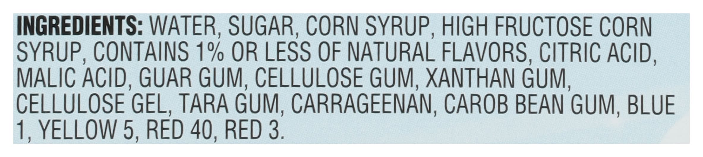 Ingredients: Water, Sugar, Corn Syrup, High Fructose Corn Syrup, Contains 1% or Less of Natural Flavors, Citric Acid, Malic Acid, Guar Gum, Cellulose Gum, Xanthan Gum, Cellulose Gel, Tara Gum, Carrageenan, Carob Bean Gum, Blue 1, Yellow 5, Red 40, Red 3.