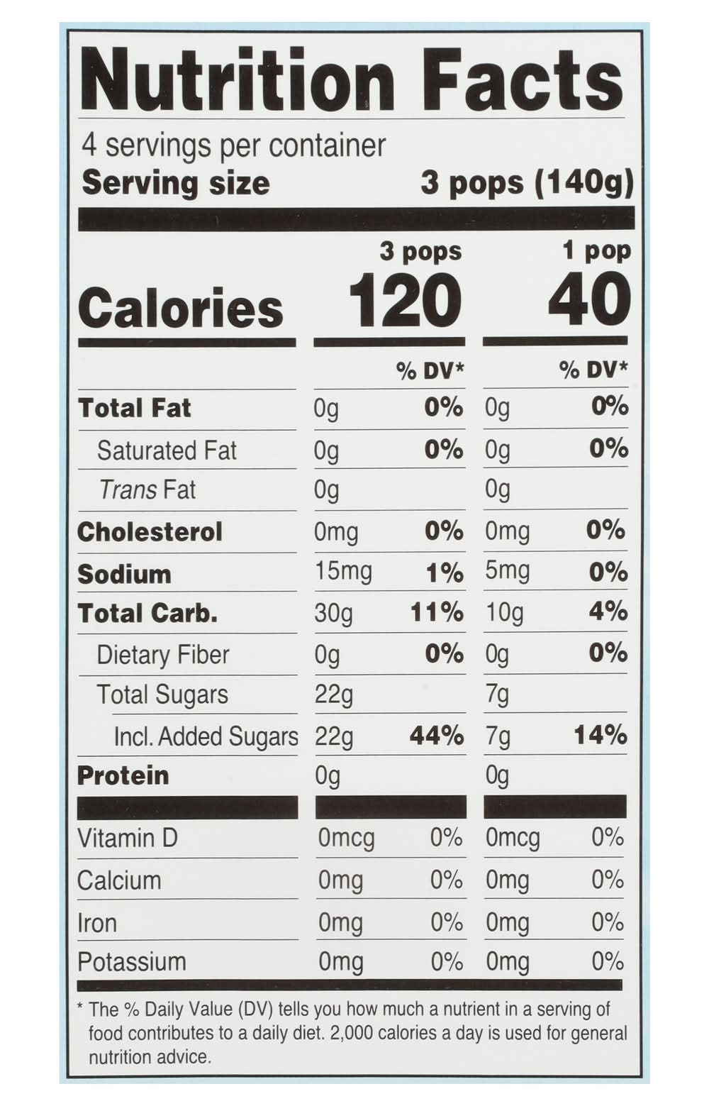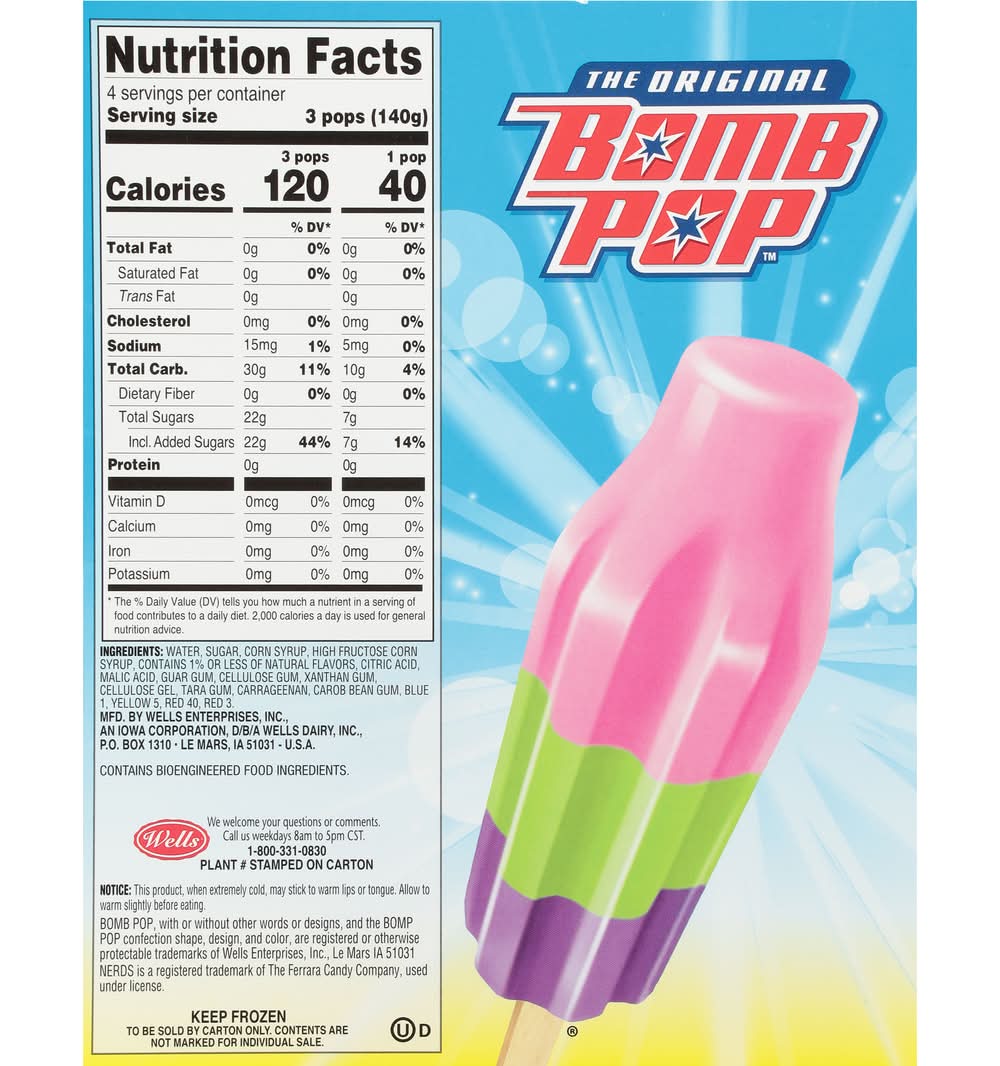 Strawberry, watermelon & grape. Naturally & artificially flavored frozen confection. Contains bioengineered food ingredients. To be sold by carton only. Contents are not marked for individual sale.The Original Bomb Pop: Original, Hawaiian Punch, Crush, Watermelon. • Flavor: Assorted • Wells Enterprises, Inc., P.O. Box 131, Le Mars, IA, 51031, USA • Packaging: Reusable