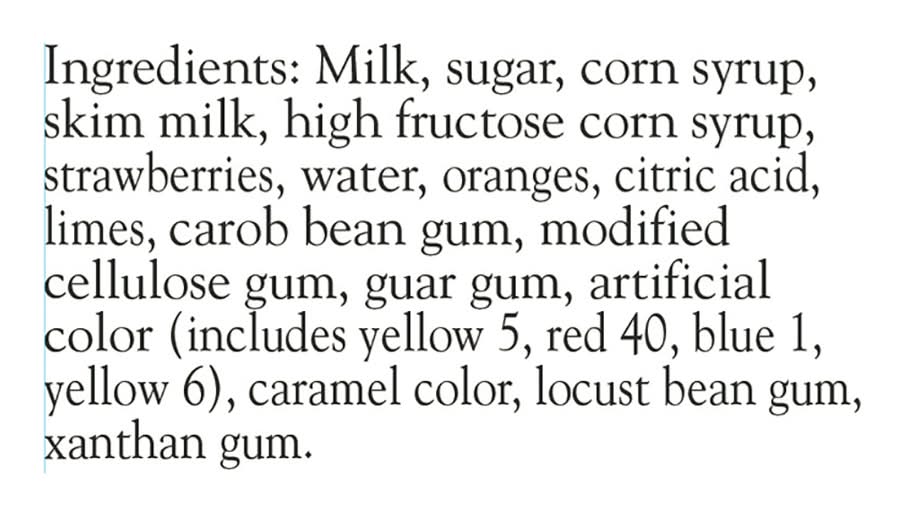 Ingredients: Milk, Sugar, Corn Syrup, Skim Milk, High Fructose Corn Syrup, Strawberries, Water, Oranges, Citric Acid, Limes, Carob Bean Gum, Modified Cellulose Gum, Guar Gum, Artificial Color (Includes Yellow 5, Red 40, Blue 1, Yellow 6), Caramel Color, Locust Bean Gum, Xanthan Gum Contains: Milk, Corn